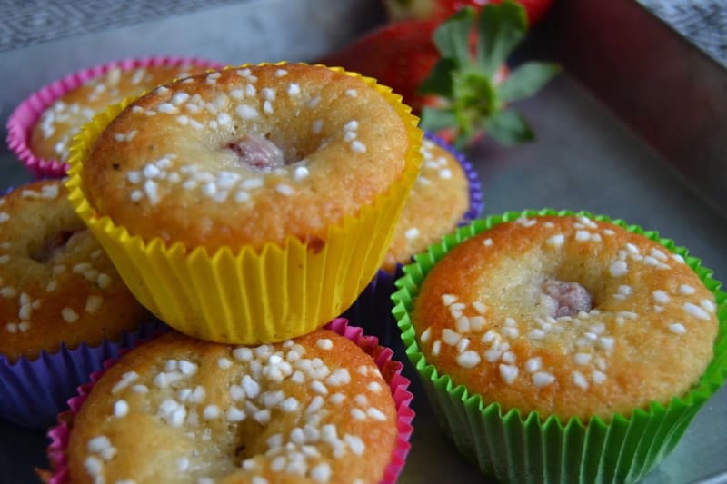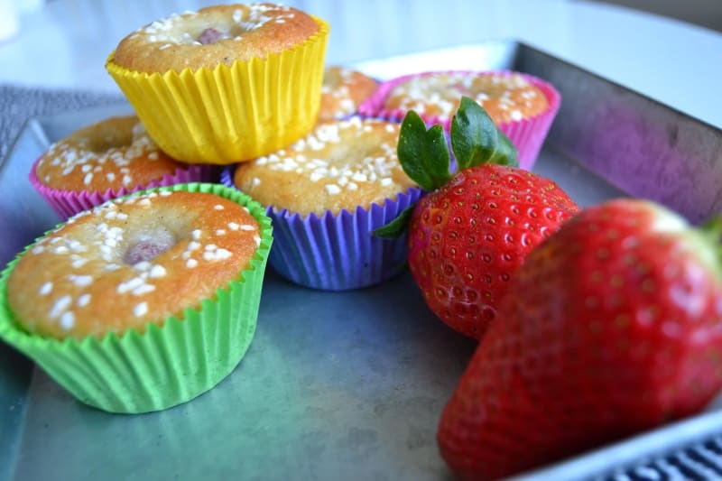 - Lägg en jordgubbe i varje muffinsform och häll i smeten, grädda och ät!