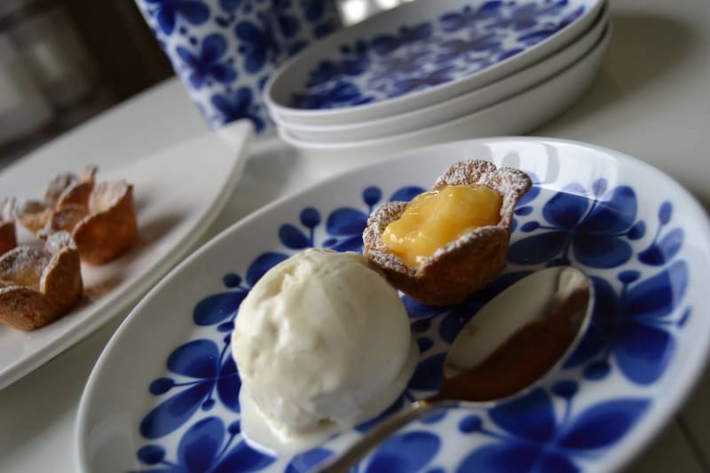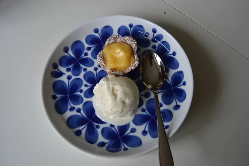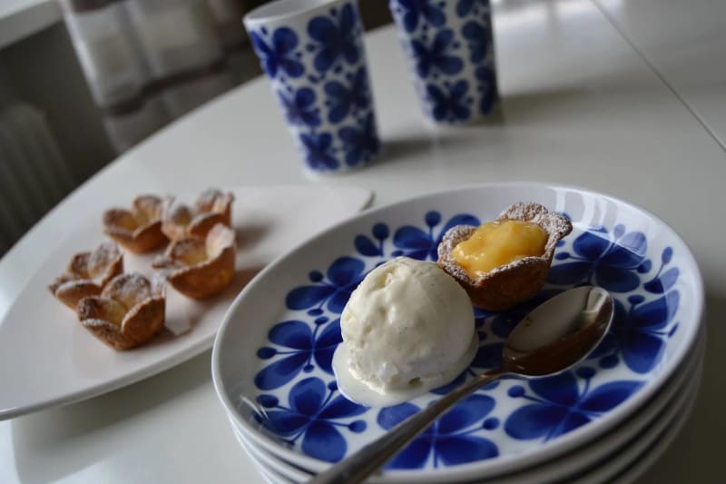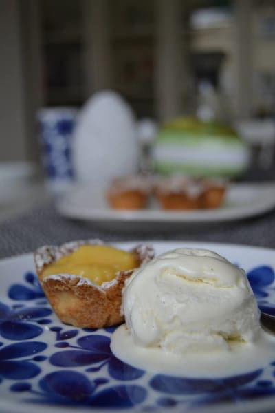 En läcker påskdessert med små mördegsblommor fyllda med lemon curd och serverade med vaniljglass.