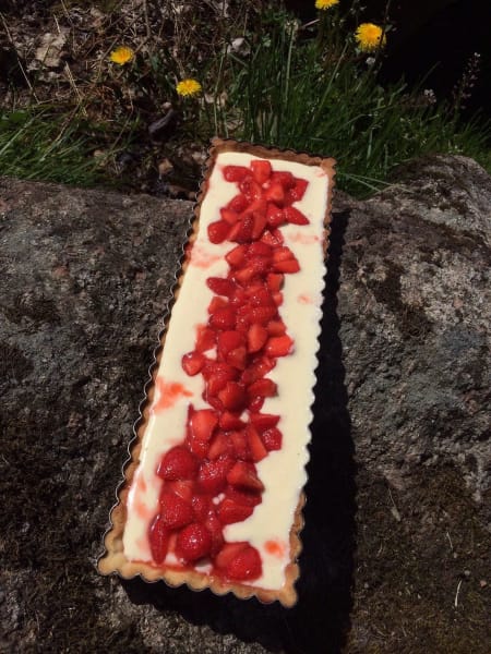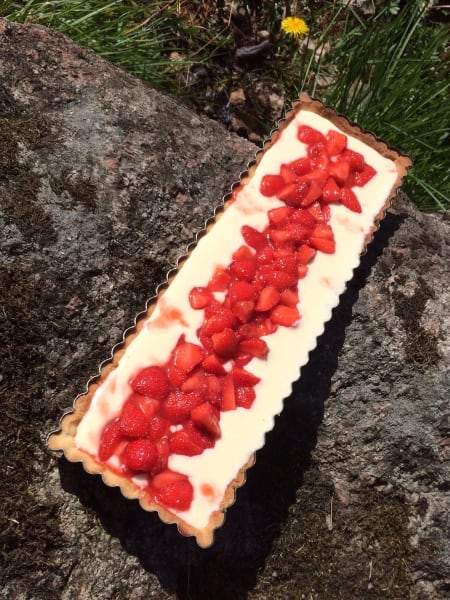En riktigt sommarpaj med vaniljkräm och limemarinerade jordgubbar.