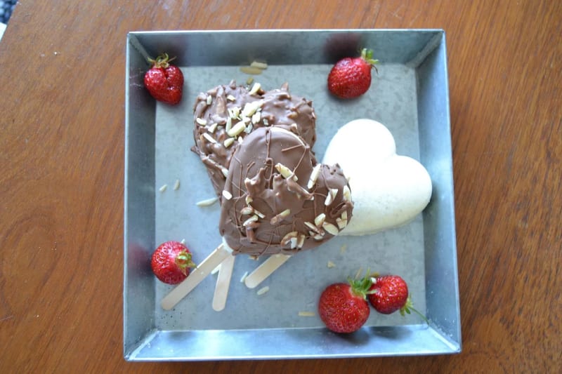 - Doppa glassarna snabbt i chokladen och strö över mandel.