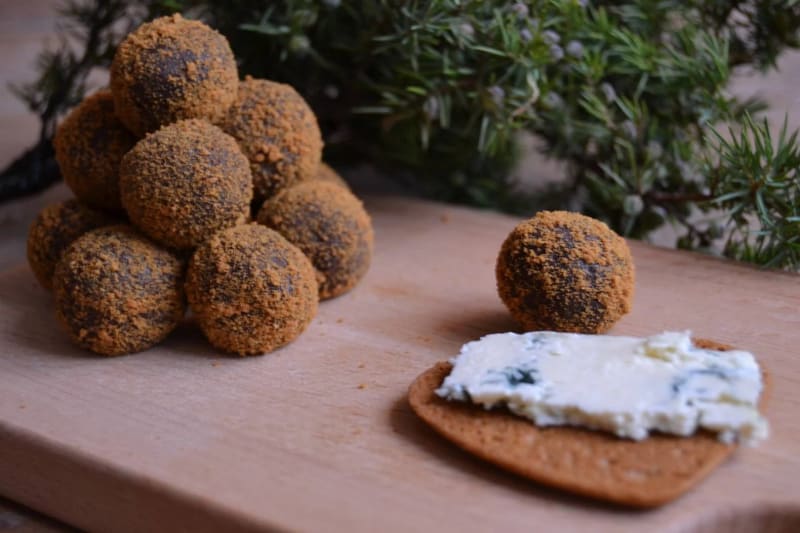 - Ta knappt en msk tryffel och tryck ut, lägg en bit ost i mitten och rulla ihop tryffeln så den täcker osten.