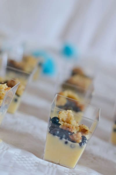En smidig och god dessert med blåbär, vaniljsås och bakad smuldeg i portionsburkar.