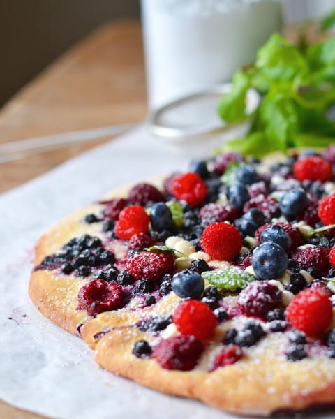 En efterrättspizza med massa bär, choklad och vaniljsås.