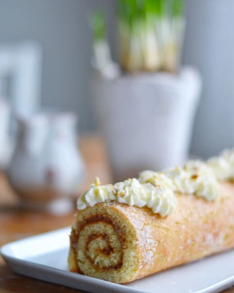 Rulltårta smaksatt med kardemumma, hemmagjord mandelmassa och grädde.