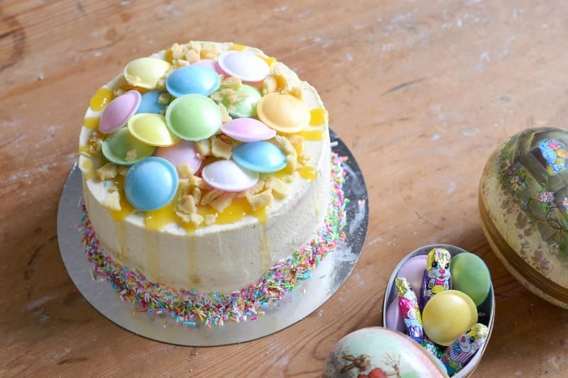 En mastig tårta med fräsch citronsmak och färgglad dekoration, perfekt för påsk.