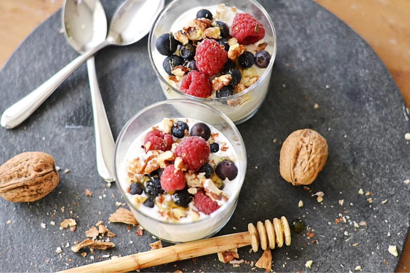 En enkel och hälsosam dessert, mellanmål eller frukost med grekisk yoghurt, valnötter, färska bär och honung.