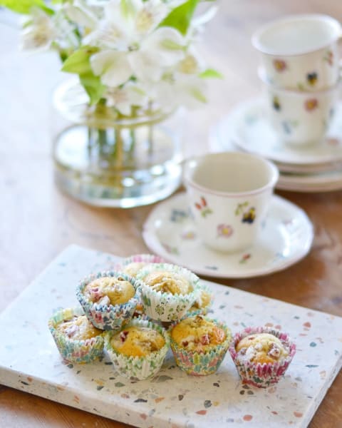- Häll upp smeten i muffinsformar och toppa med en tsk rabarber.
