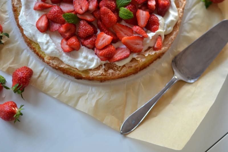 En enkel och uppskattad tårta med jordgubbar.