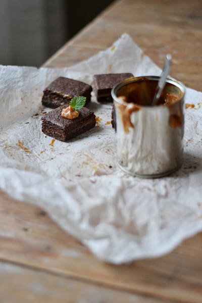 - Bred ut den karamelliserade mjölken (kolan) på ena delen och strö över flingsalt, lägg sedan på den andra delen på toppen.