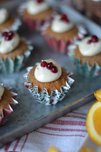 Recept på mumsiga muffins smaksatta med pepparkakskrydda och toppade med en frosting av creme fraiche och kardemumma.