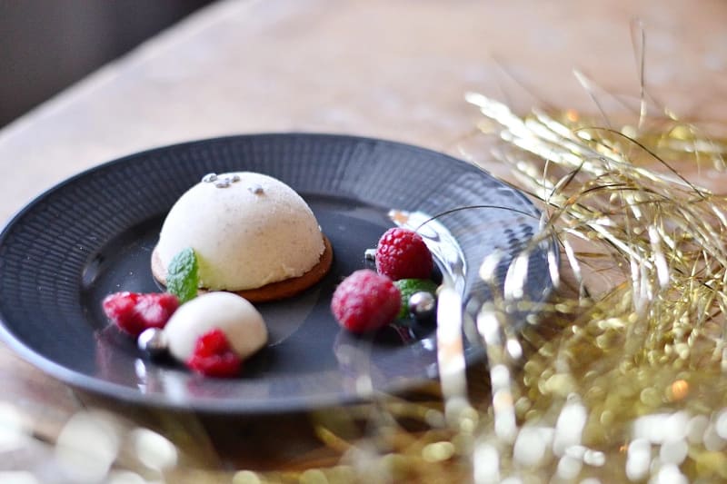 En variant på pannacotta gjord på gelésocker istället för gelatin. Serveras med pepparkakor, färska bär och strössel.