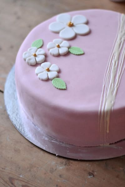- Kavla ut marsipan och täck tårtan med den.
