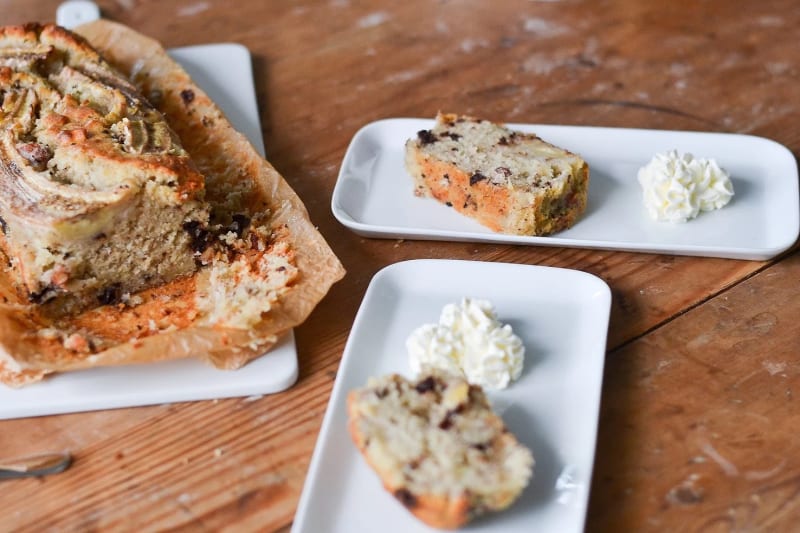 Ett perfekt recept för att använda övermogna bananer. Bananbrödet är saftigt och smakrikt med inslag av mandel och choklad.