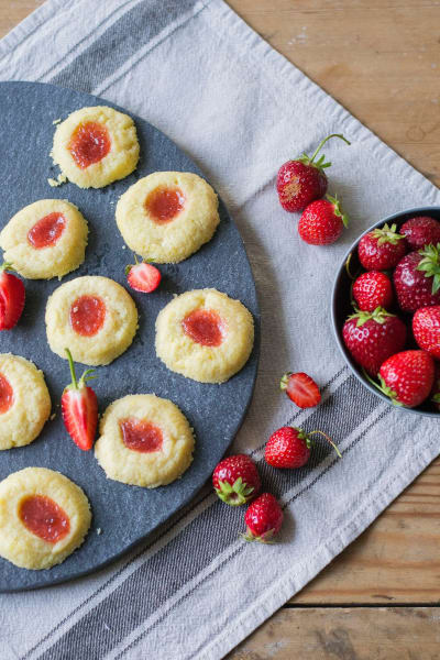 Ett recept på sommargrottor, goda små kakor med sommarsylt i mitten.