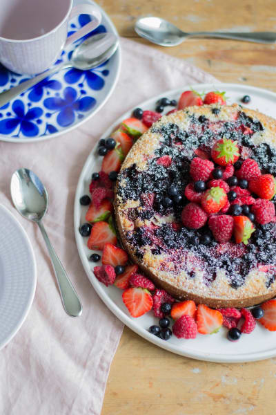 En ljus kladdkaka fylld med blåbär, hallon och jordgubbar.