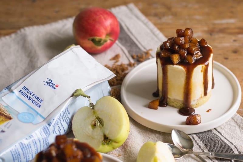En riktig höstbakelse med kardemummabotten, äppelmousse och karamelliserade äpplen på toppen.
