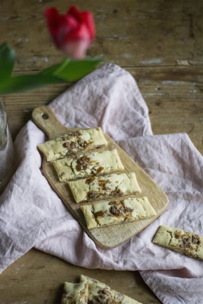 - Forma degen till två rullar, lägg dem med mellanrum på en bakplåtspappersklädd plåt och platta till dem lite försiktigt.