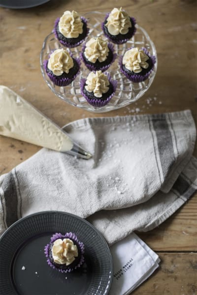 - Montera en tyll i en spritspåse och fyll den sedan med smörkrämen och spritsa sedan alla muffinsen med den ljuvliga salta kolafrostingen.