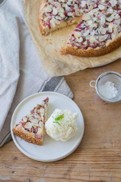 - Bred ut smeten i formen och toppa med rabarberblandningen jämnt fördelad över.