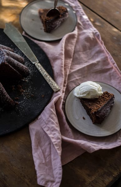 - Klicka i smeten i en välsmord och mjölad (använd kakao för lite mer chokladsmak) sockerkaksform, grädda i mitten av ugnen.