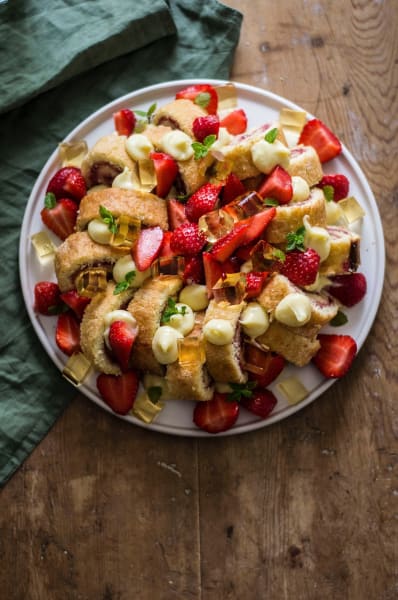 - <p class=”ql-align-justify”>Skär rulltårtan i 1,5 cm tjocka skivor och lägg som ring på ett ett fat. Montera en rund stor tyll i en spritspåse och fyll på med vaniljkräm. Spritsa ordentligt med kräm på rulltårtsbitarna. <p class=”ql-align-justify”>Skär jellon i små kuber och fördela över rulltårtan. Fyll på med jordgubbar, mer vaniljkräm och kanske även lite mynta eller citronmeliss. Klart att avnjutas!