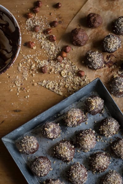 - Lägg bollarna på ett bakplåtspapper för att rinna av och toppa med hackade hasselnötter innan chokladen stelnar.