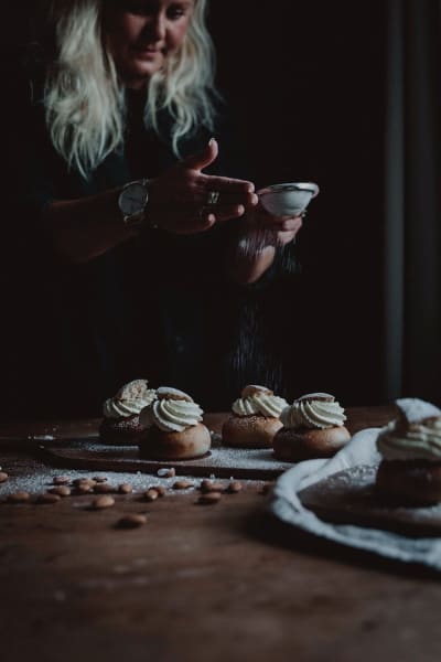 - Vispa grädden och fyll i en spritspåse med grövre tyll. Fyll också gärna mandelmassan i en spritspåsen för att enklare kunna fylla semlan. Klipp eller skär bort locket, gröp ur lite inkrom om det inte följer med tillräckligt från locket. Fyll på med mandelmassa och spritsa grädden över. Lägg på locket och pudra med florsocker på toppen precis innan servering.