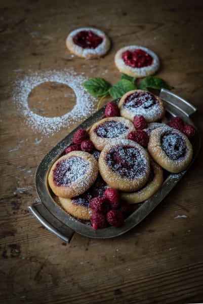 Hoppas du har hallon eller åtminstone hallonsylt över sen bullarna i förra receptet! För här är ytterligare ett gott sätt att ta hand om alla ljuvliga hallon som finns just nu i snåren.Fyll grottorna med hallonsylt eller gör som jag gjorde och bara mossa ihop bären med lite lite socker så de blir som rårörda! Oavsett blir det här magiskt gott:)De går fort att göra så blir en perfekt paus från solstolen idag!Puss hej!