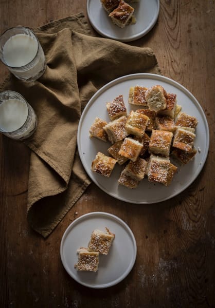 - Kavla ut degen till en stor rektangel. Bred på fyllningen jämnt över hela degplattan, och vik sedan rektangeln i ett treslag, alltså att det blir tre lager deg med fyllning mellan varje.