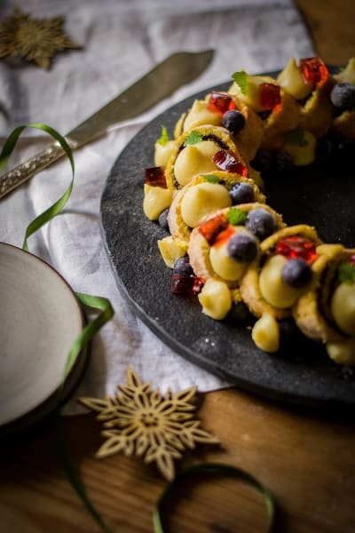 - <p class=”ql-align-justify”>Skär rulltårtan i 1,5 cm tjocka skivor och lägg som ring på ett ett fat. Montera en rund stor tyll i en spritspåse och fyll på med vaniljkräm. Spritsa ordentligt med kräm på rulltårtsbitarna.<p class=”ql-align-justify”>Skär jellon i små kuber och fördela över rulltårtan. Fyll på med blåbär och kanske även lite mynta eller citronmeliss. Klart att avnjutas!